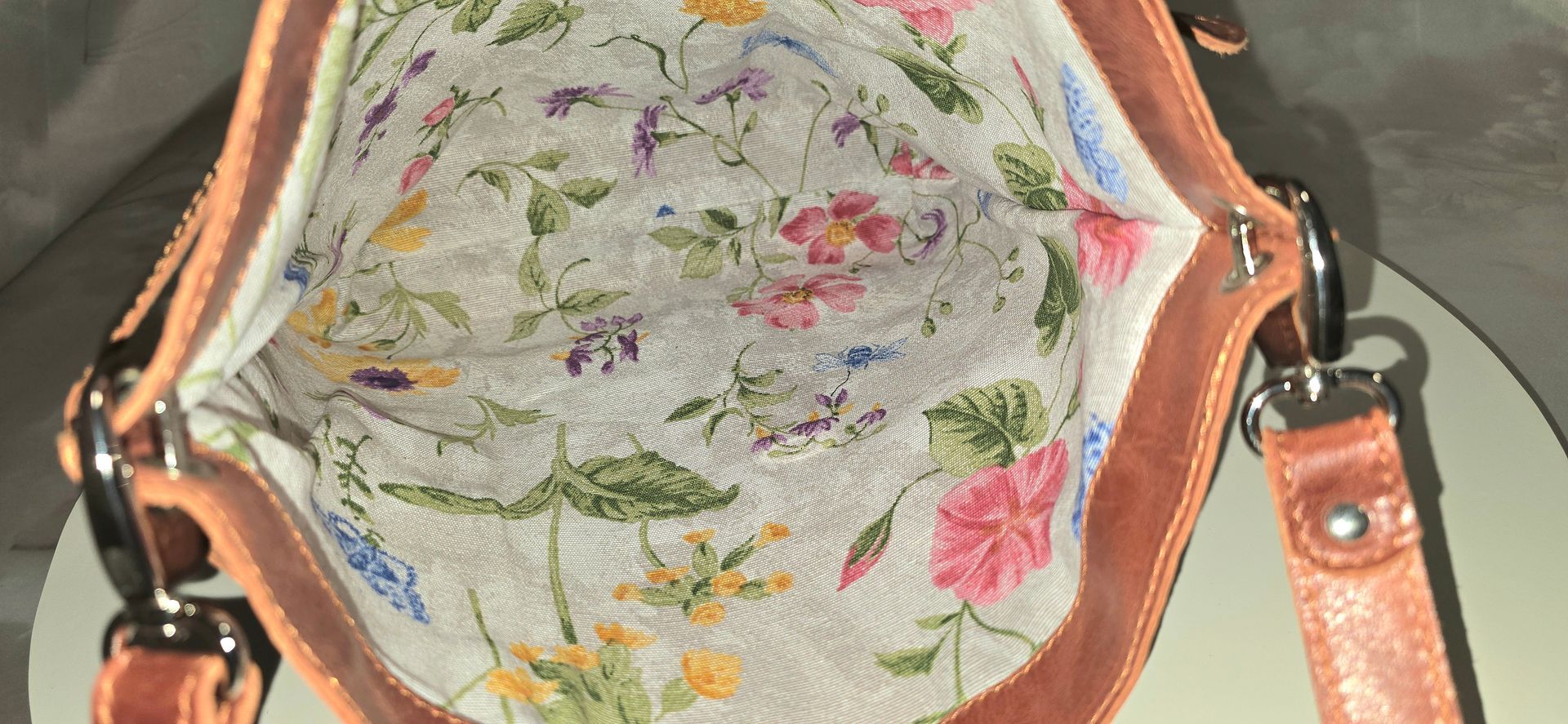 De binnenkant heeft stoffen voering in fris bloemenpatroon.