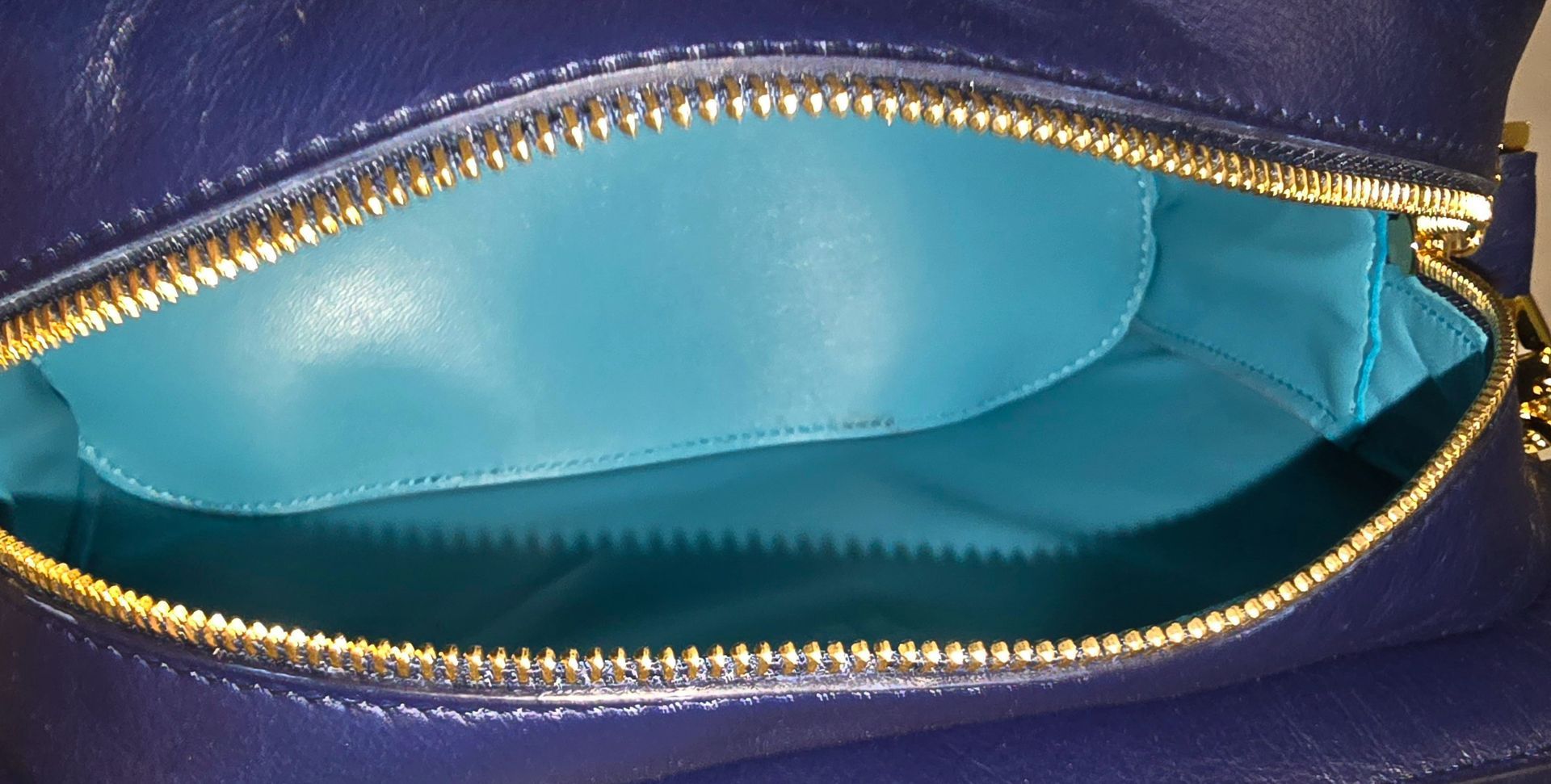 Een sportieve damestas met handvat verwerkt in panden en losse draagriem in turqoise leer.